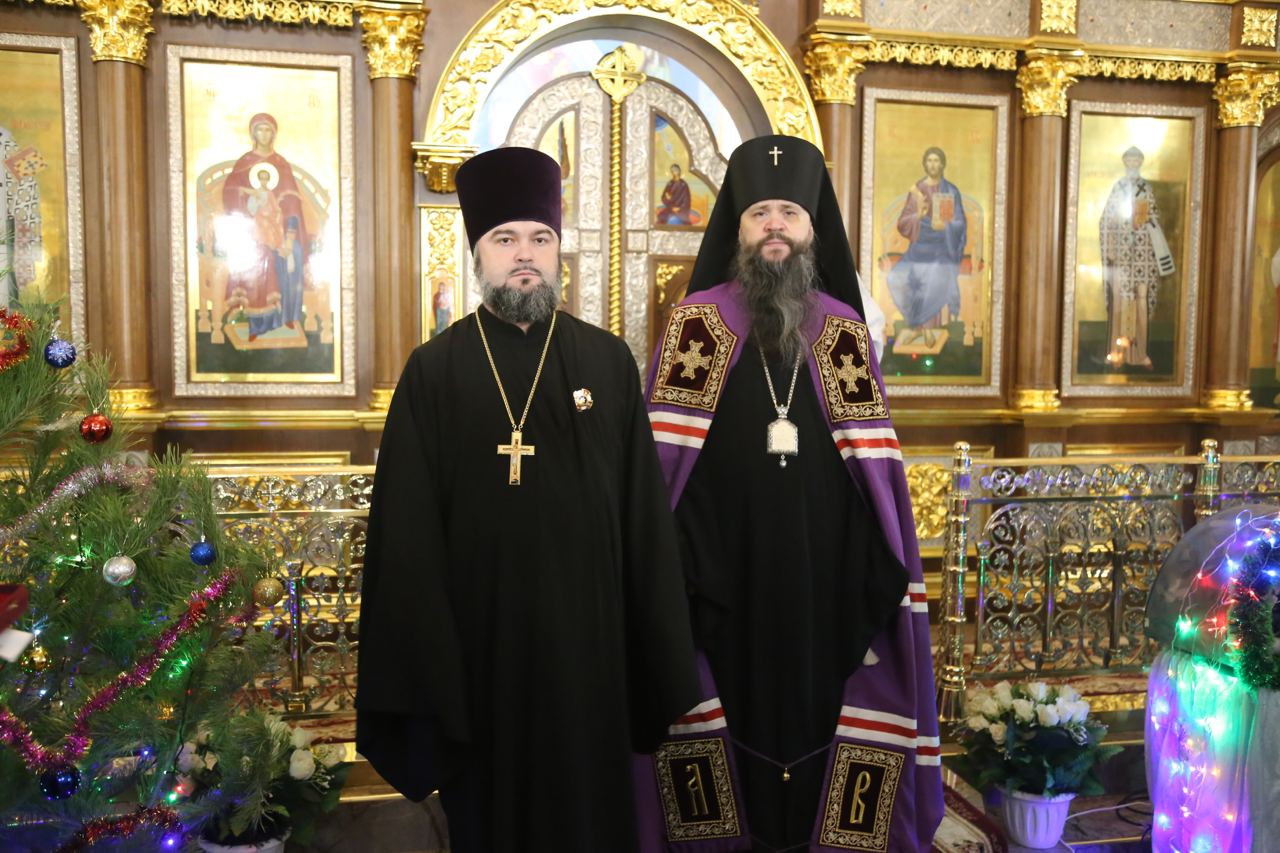 За Божественной литургией Его Высокопреосвященству сослужили секретарь епархии иеромонах Силуан (Исаев-Баидаури), настоятель станичного храма Рождества Христова иерей Павел Корякин, настоятель Казанского храма в Каспийске иеромонах Иоанн (Анисимов).