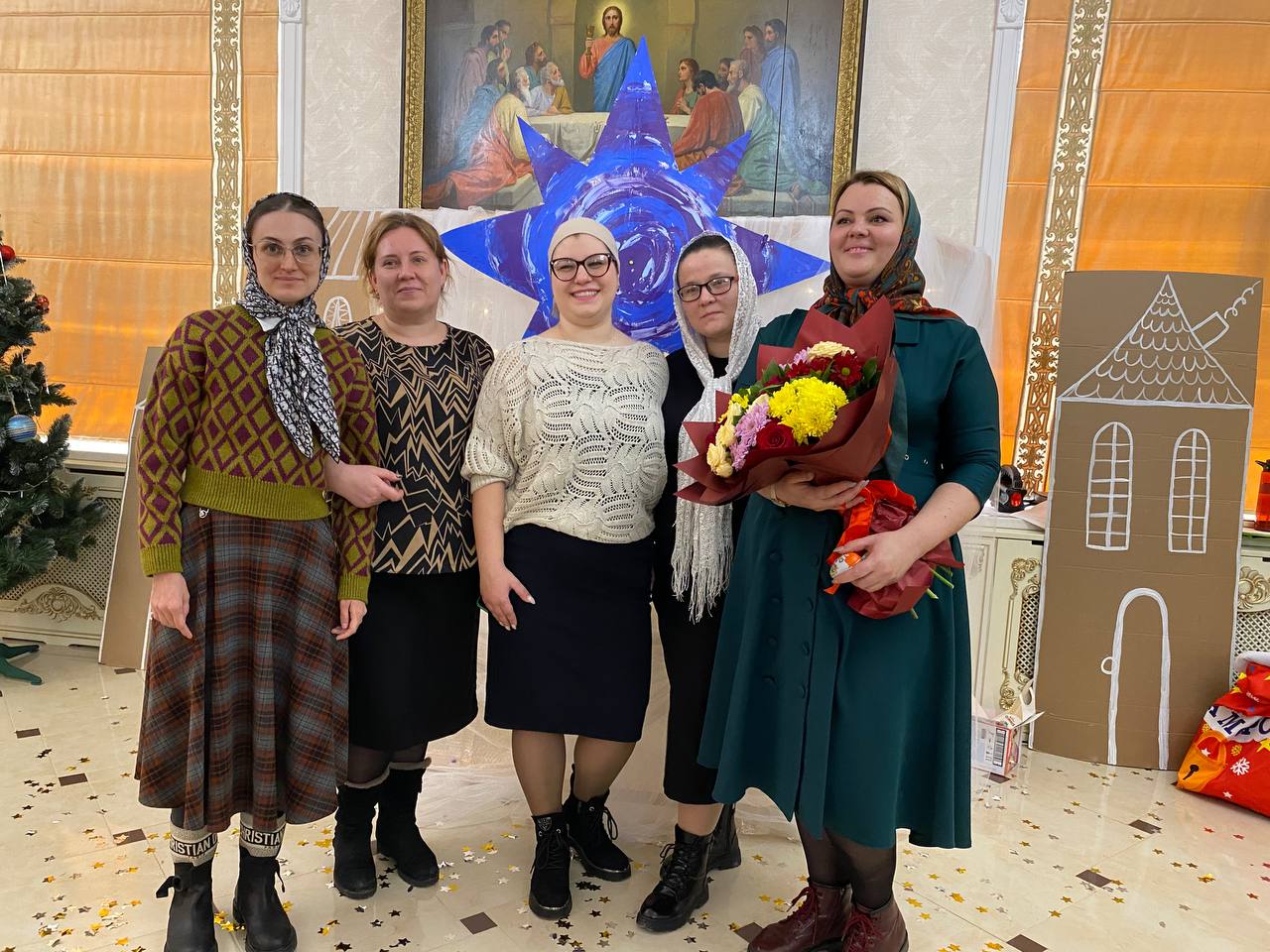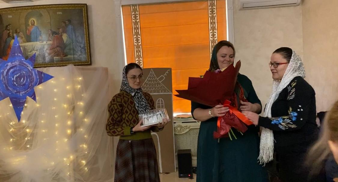 Педагоги воскресной школы поздравили директора Наталию Николаевну Лысову с Рождеством Христовым, пожелав крепости духовных и телесных сил, и вручили букет цветов и подарок.