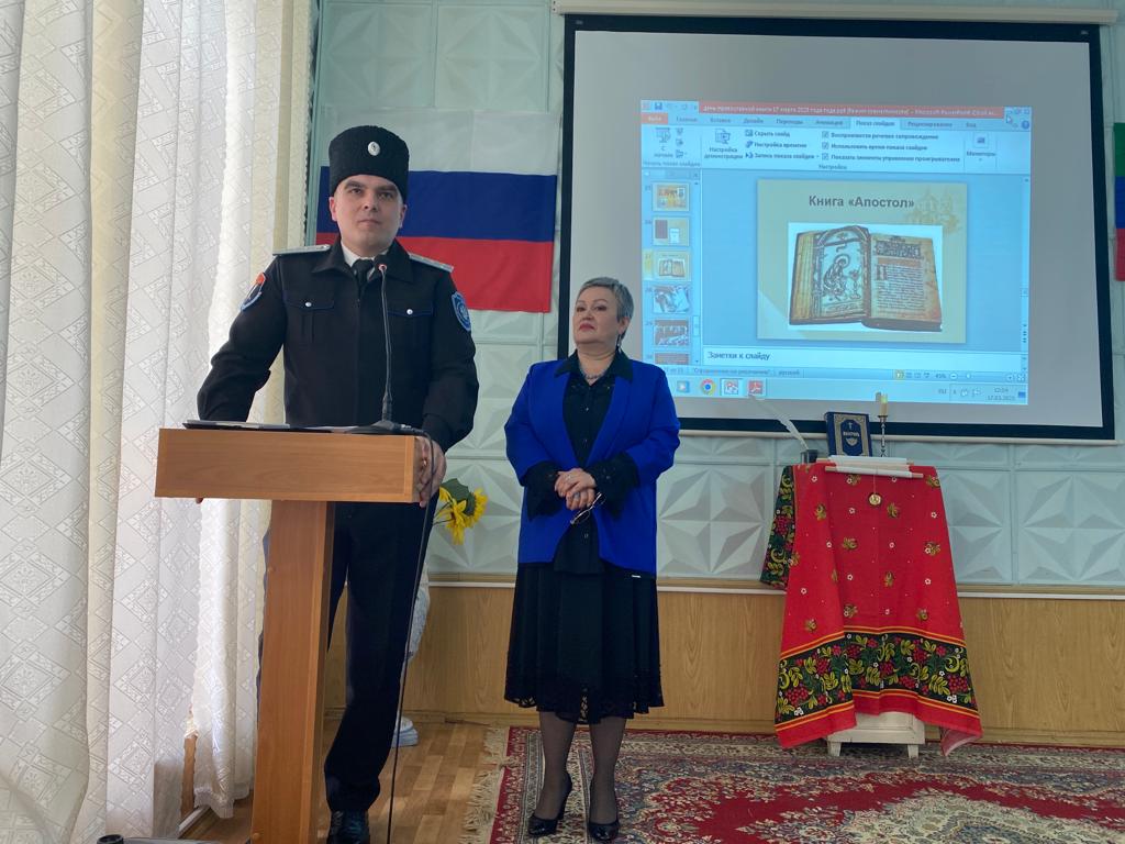 Именно 1 марта (по старому календарю) 1564 года в России издана первая печатная книга «Апостол». Как произошло это важнейшее событие духовной истории страны и о первом русском печатнике Иване Фёдорове, его сподвижниках, о том, какое значение имело это событие для России, достаточно подробно сказала ведущая, зав. Кизлярским филиалом ГБУ Л.А. Мстиславская. Её выступление дополнялось яркой презентацией и видеосюжетом, что были подготовлены научным сотрудником Т.В. Солдатовой.