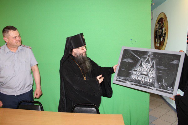 В заключение заместитель начальника учреждения И.П. Медведев подарил Его Высокопреосвященству картину с изображением храма, написанную осужденными специально для высокого гостя.