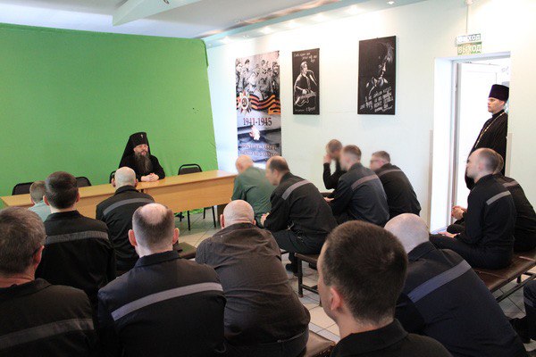 В актовом зале клуба ИК-11 архипастырь провел с заключенными беседу на духовные темы.