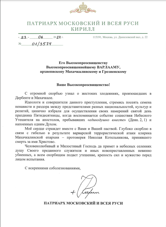 Обращение Святейшего Патриарха Московского и всея Руси Кирилла архиепископу Варлааму в связи с событиями в Махачкале и Дербенте