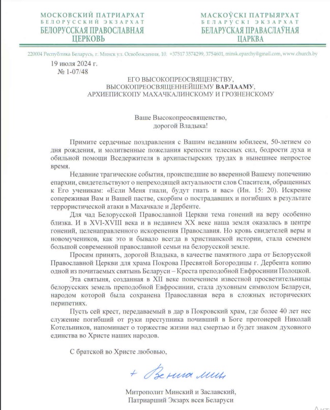 Обращение митрополита Минского и Заславского Вениамина, Патриаршего Экзарха всея Беларуси архиепископу Махачкалинскому и Грозненскому Варлааму