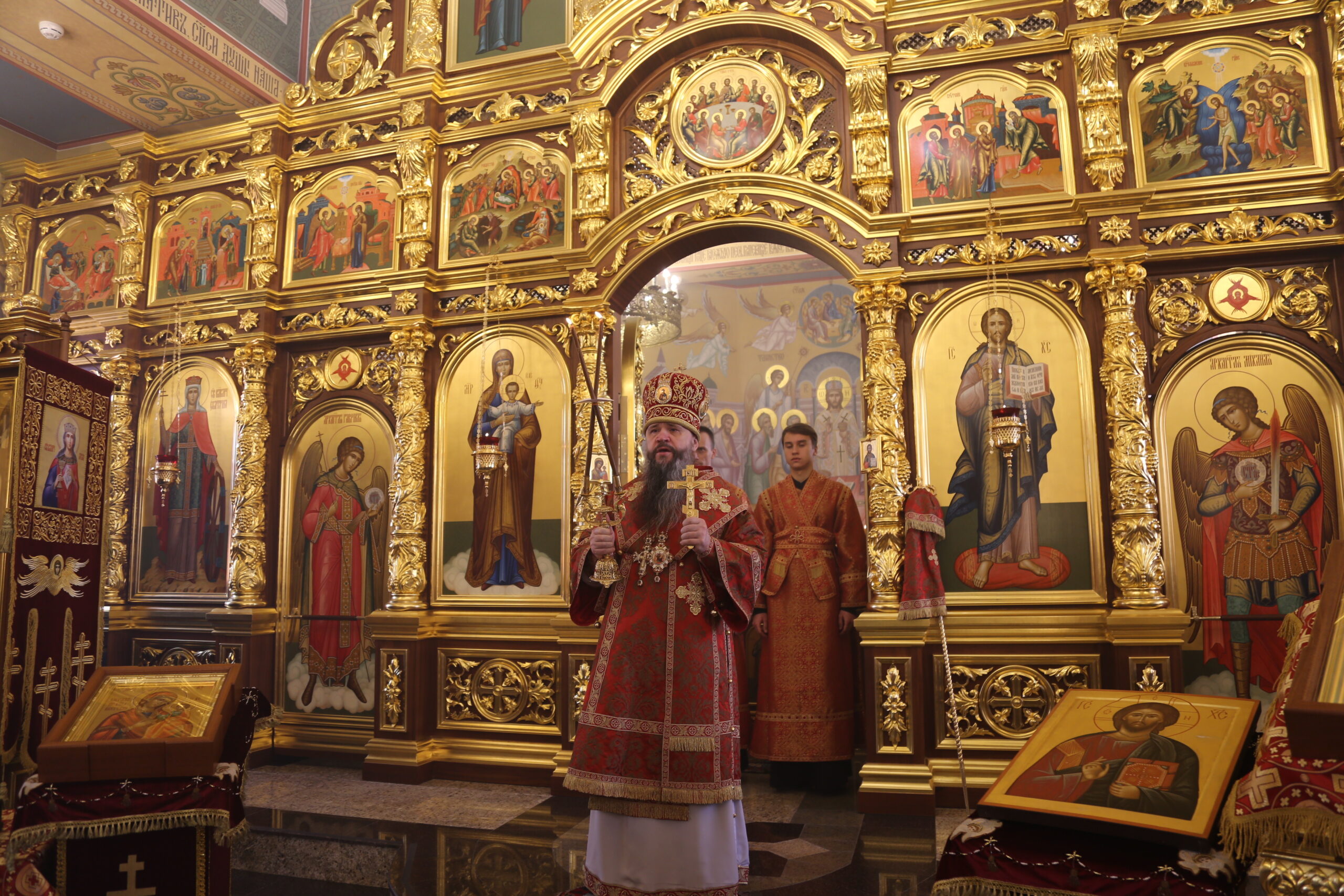 По окончании богослужения архиепископ Варлаам поздравил всех прихожан с престольным праздником, затем со словами благодарности к архипастырю обратился настоятель храма и преподнёс букет красных роз.