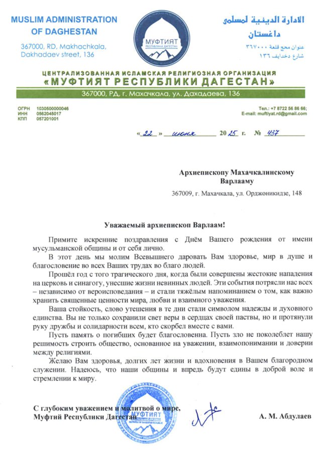 - Поздравление архиепископа Варлаама Муфтию Республики Дагестан с праздником Ураза-Байрам