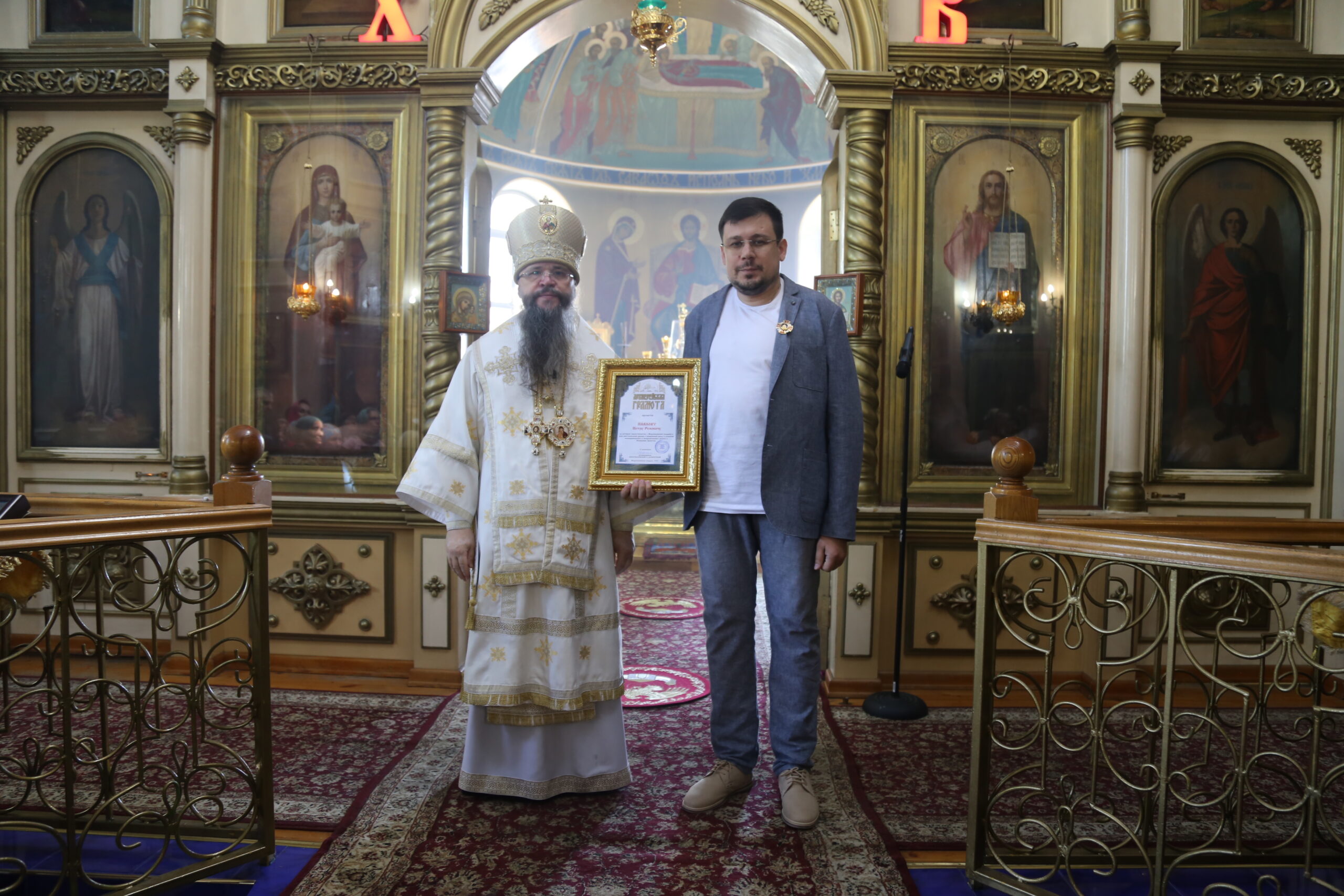 После отпуста архипастырь вручил епархиальные награды. «За активное соработничество с Махачкалинской епархией в деле восстановления храмов и неоценимый вклад в развитие межнационального и межрелигиозного диалога в Республике Дагестан» архиерейской грамоты был удостоен руководитель ООО «Скифос-РСК» Петр Павлов.