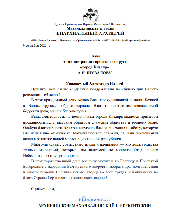 - Поздравительное послание архиепископа Варлаама сенатору Российской Федерации С.А. Керимову