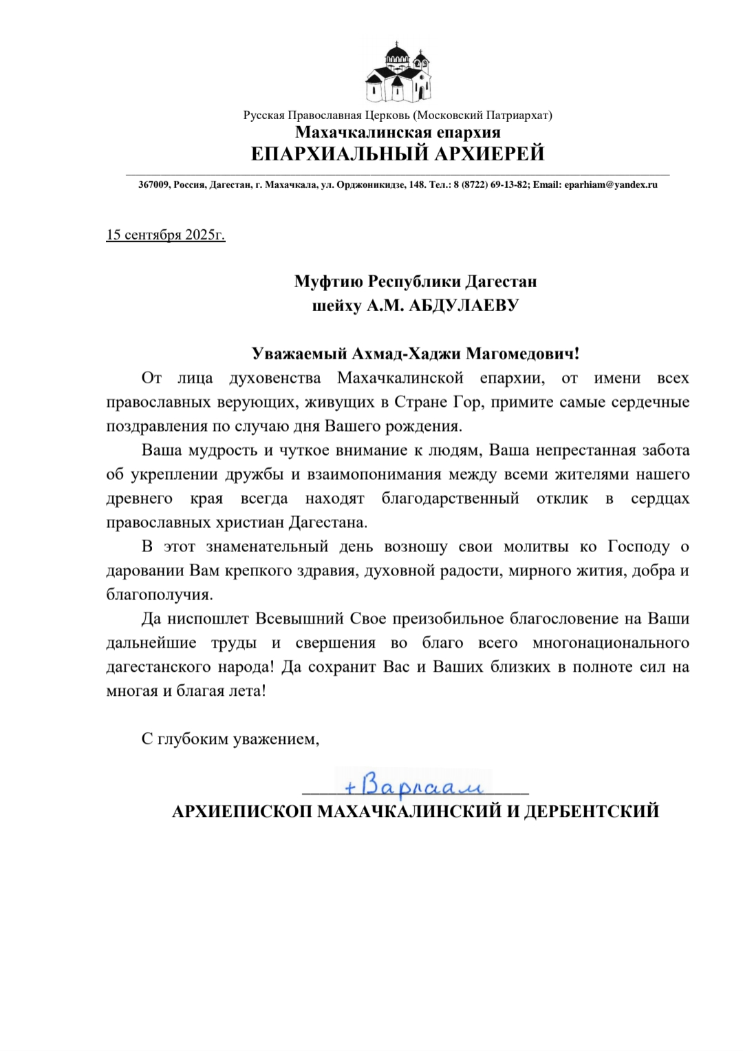- Поздравление архиепископа Варлаама Муфтию Республики Дагестан с праздником Ураза-Байрам