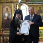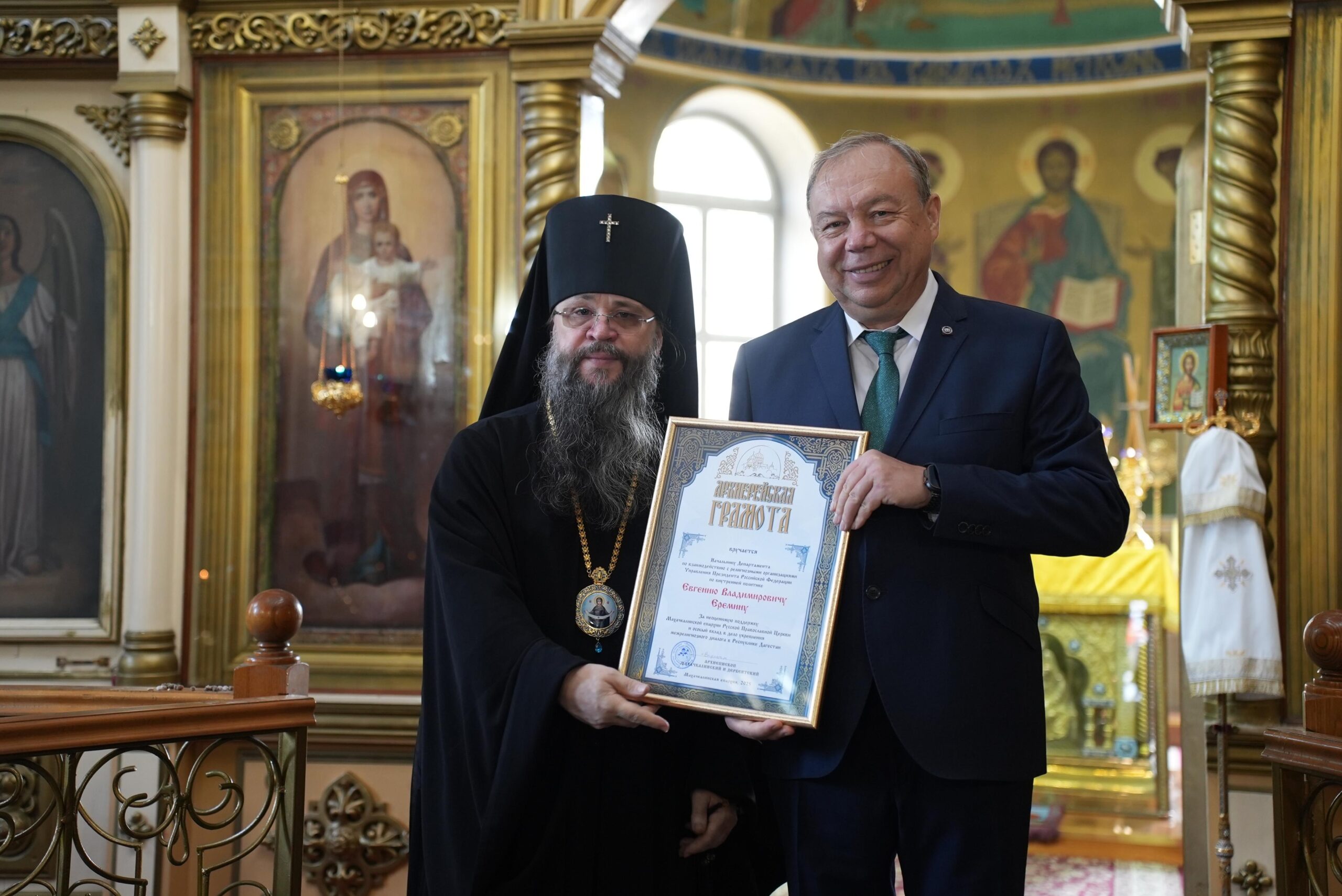 Затем владыка Варлаам вручил архиерейскую грамоту «За неоценимую поддержку Махачкалинской епархии Русской Православной Церкви и особый вклад в дело укрепления межрелигиозного диалога в Республике Дагестан» начальнику Департамента по взаимодействию с религиозными организациями Управления Президента Российской Федерации по внутренней политике Евгению Владимировичу Еремину.