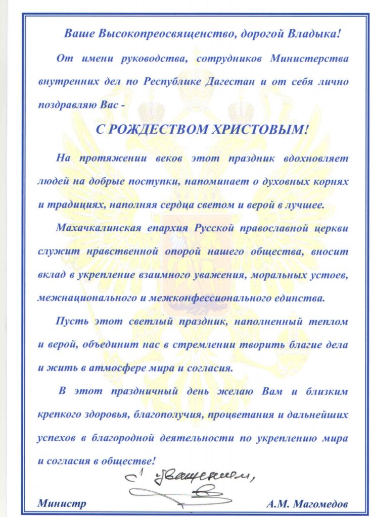 Поздравление главы МВД по Республике Дагестан А.М. Магомедова с Рождеством Христовым