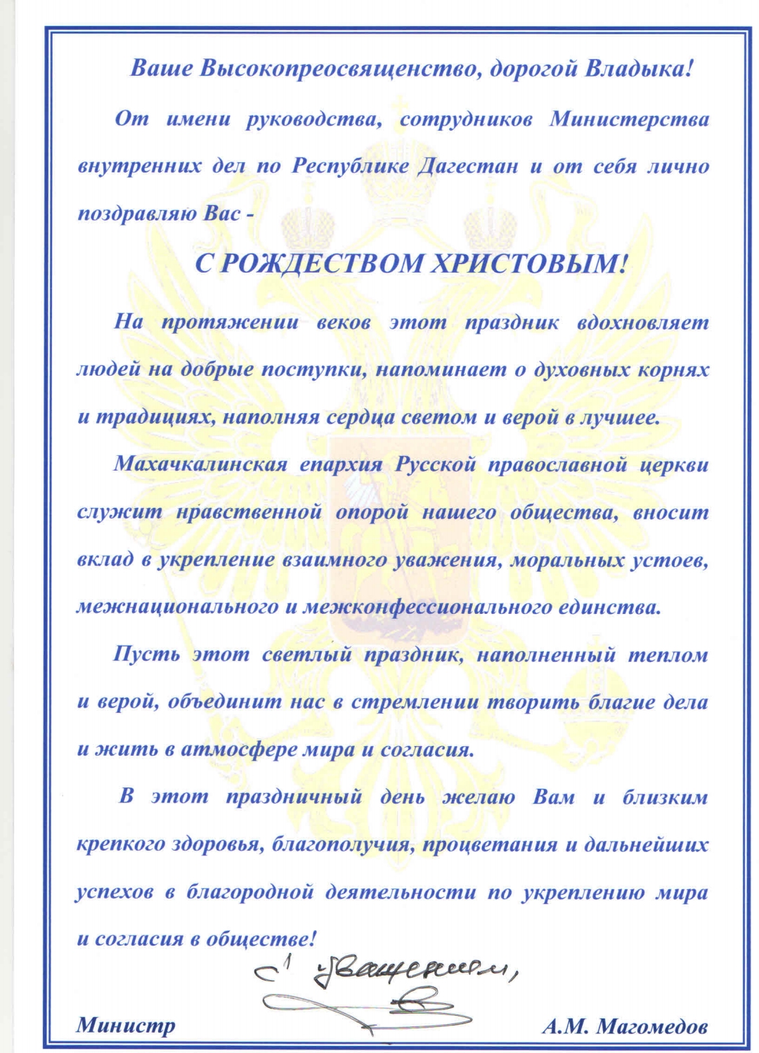 Поздравление главы МВД по Республике Дагестан А.М. Магомедова с Рождеством Христовым