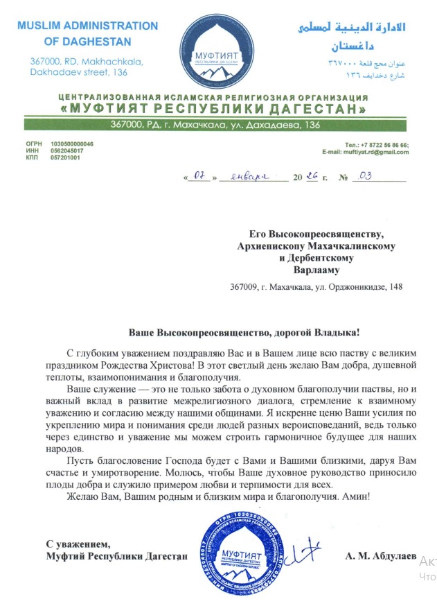 - Поздравление архиепископа Варлаама Муфтию Республики Дагестан с праздником Ураза-Байрам