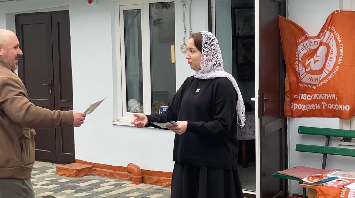 Воспитанники воскресной школы раздавали прохожим информационные флаеры и рассказывали о цели акции, стараясь напомнить о важности защиты жизни до рождения.
