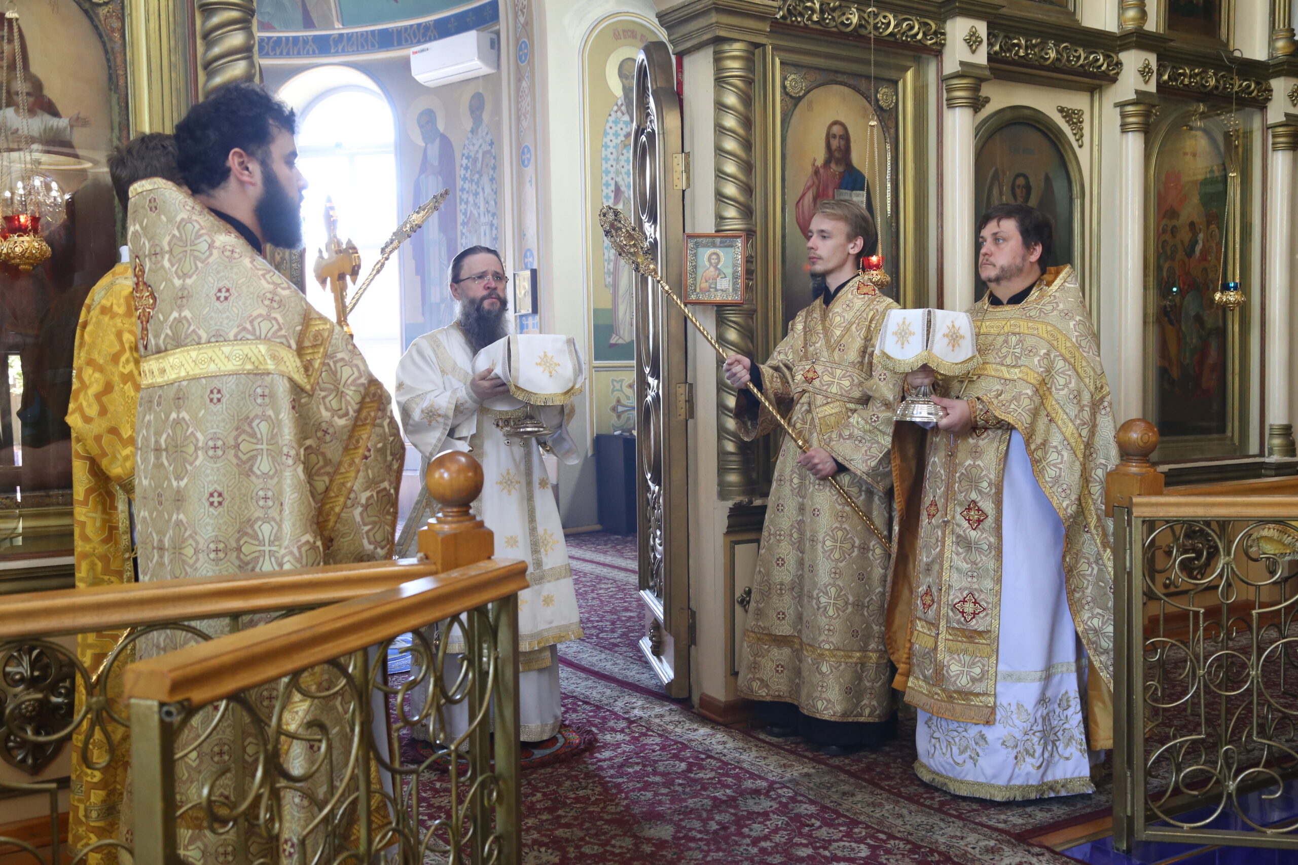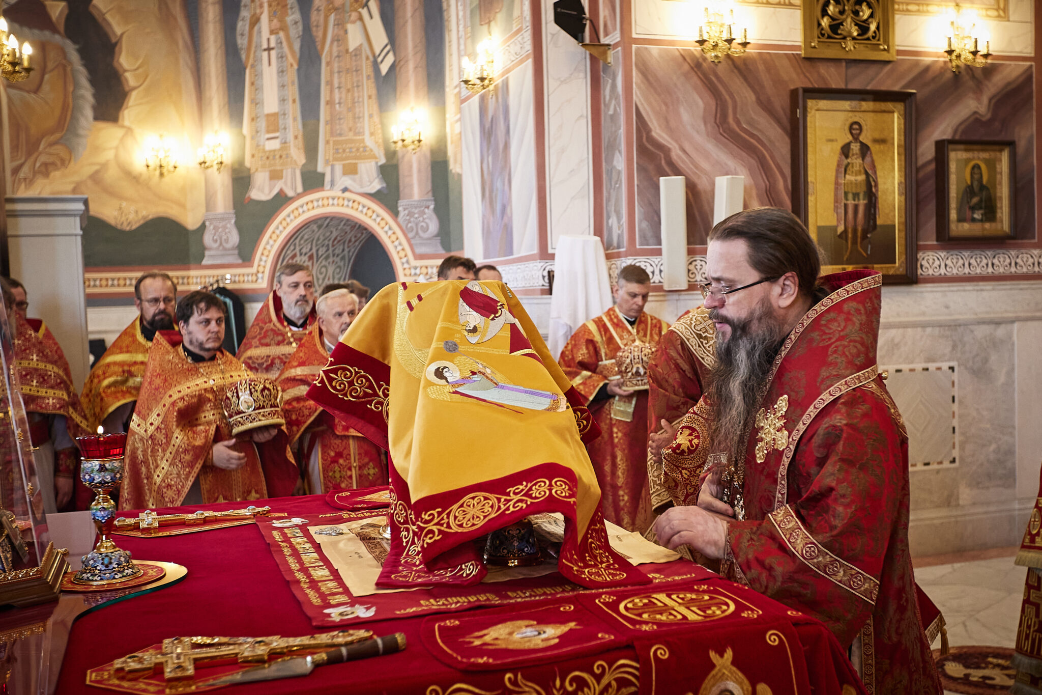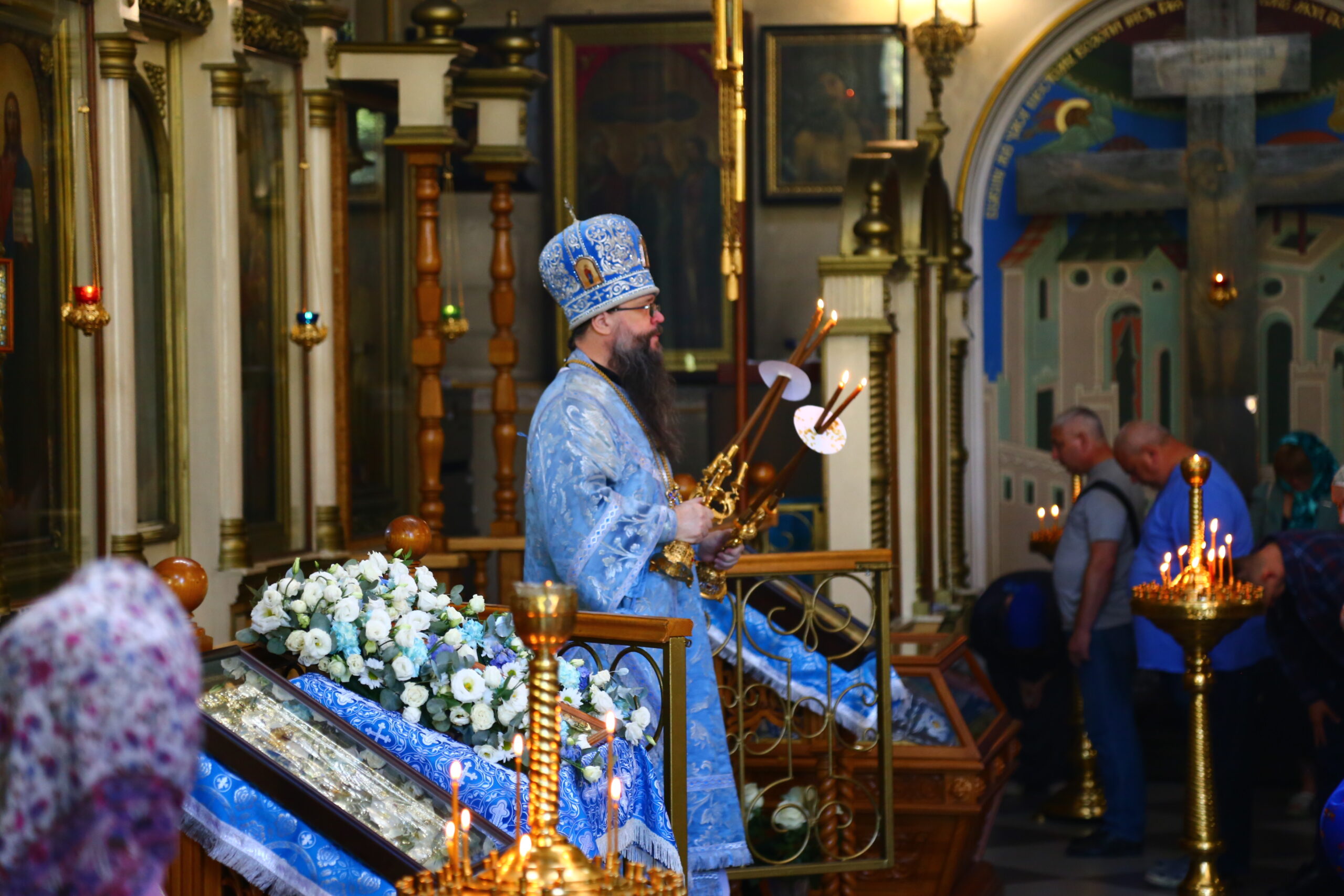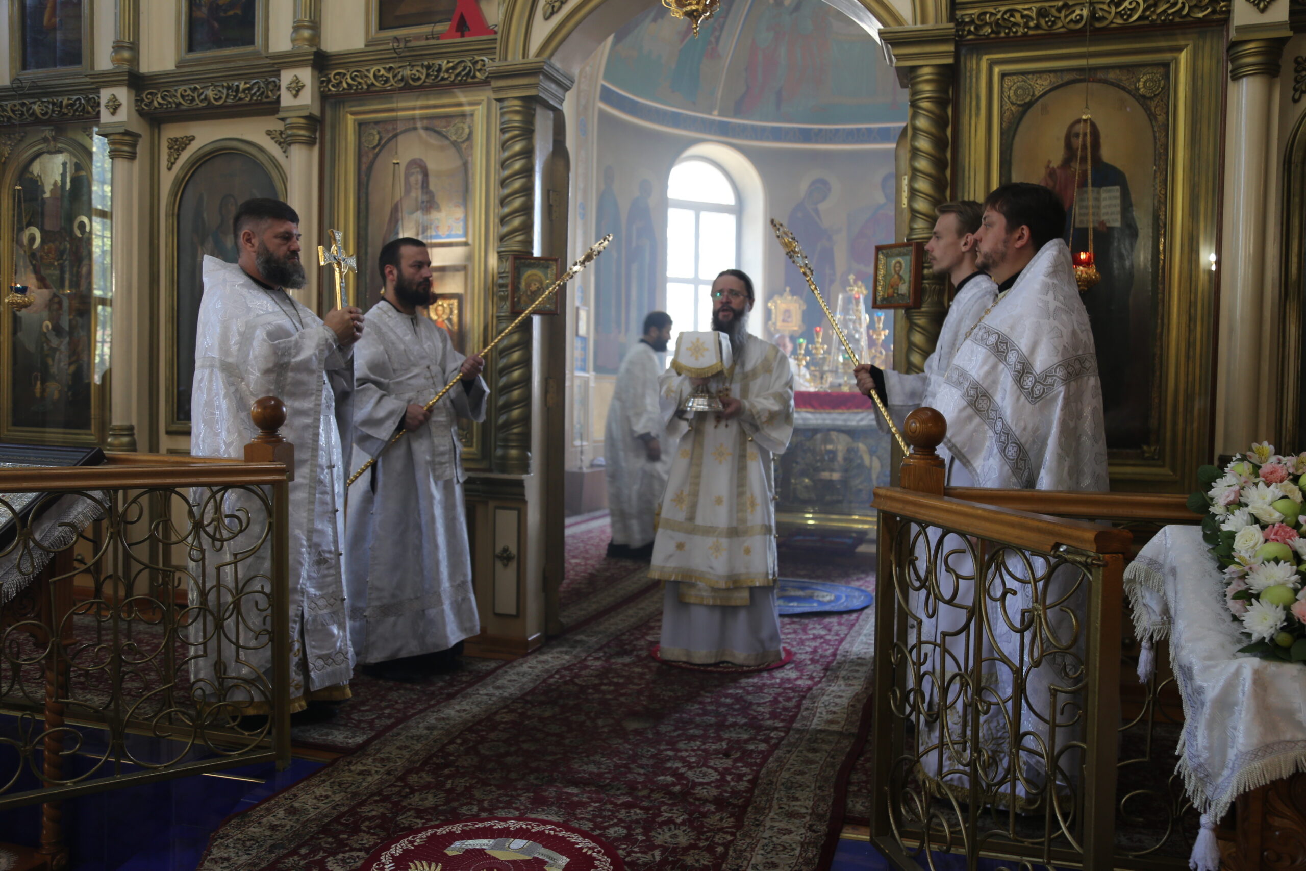 15 сентября 2024 года в неделю 12-ю по Пятидесятнице, перенесение мощей блгвв. кн. Петра, и кн. Февронии, Муромских чудотворцев, архиепископ Махачкалинский и Грозненский Варлаам возглавил Божественную литургию в Свято-Успенском кафедральном ...